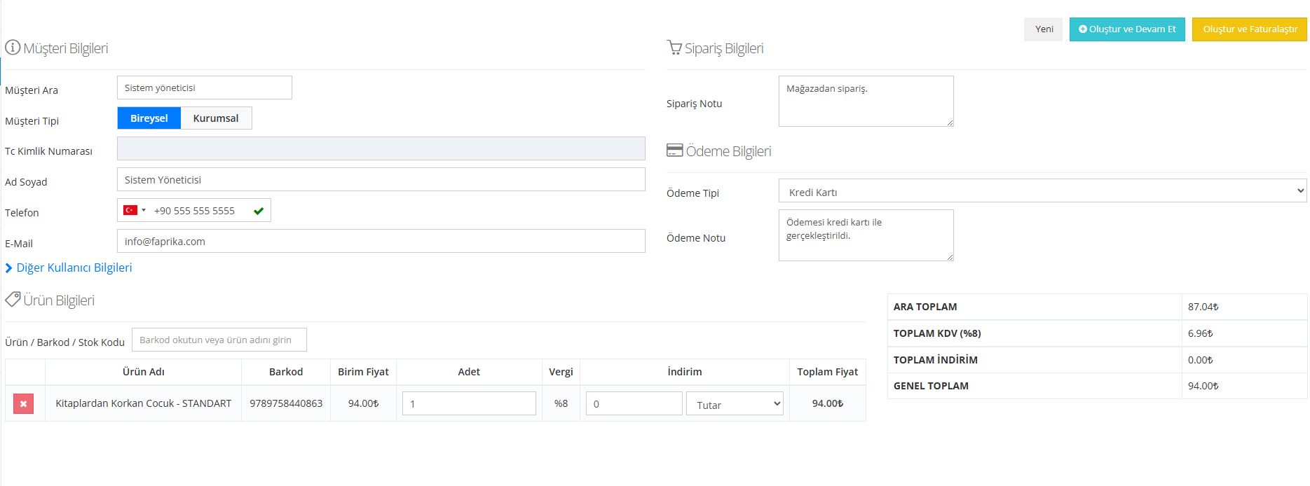 Oluştur ve Faturalandır: Siparişi doğrudan faturalandırma sürecine taşır.